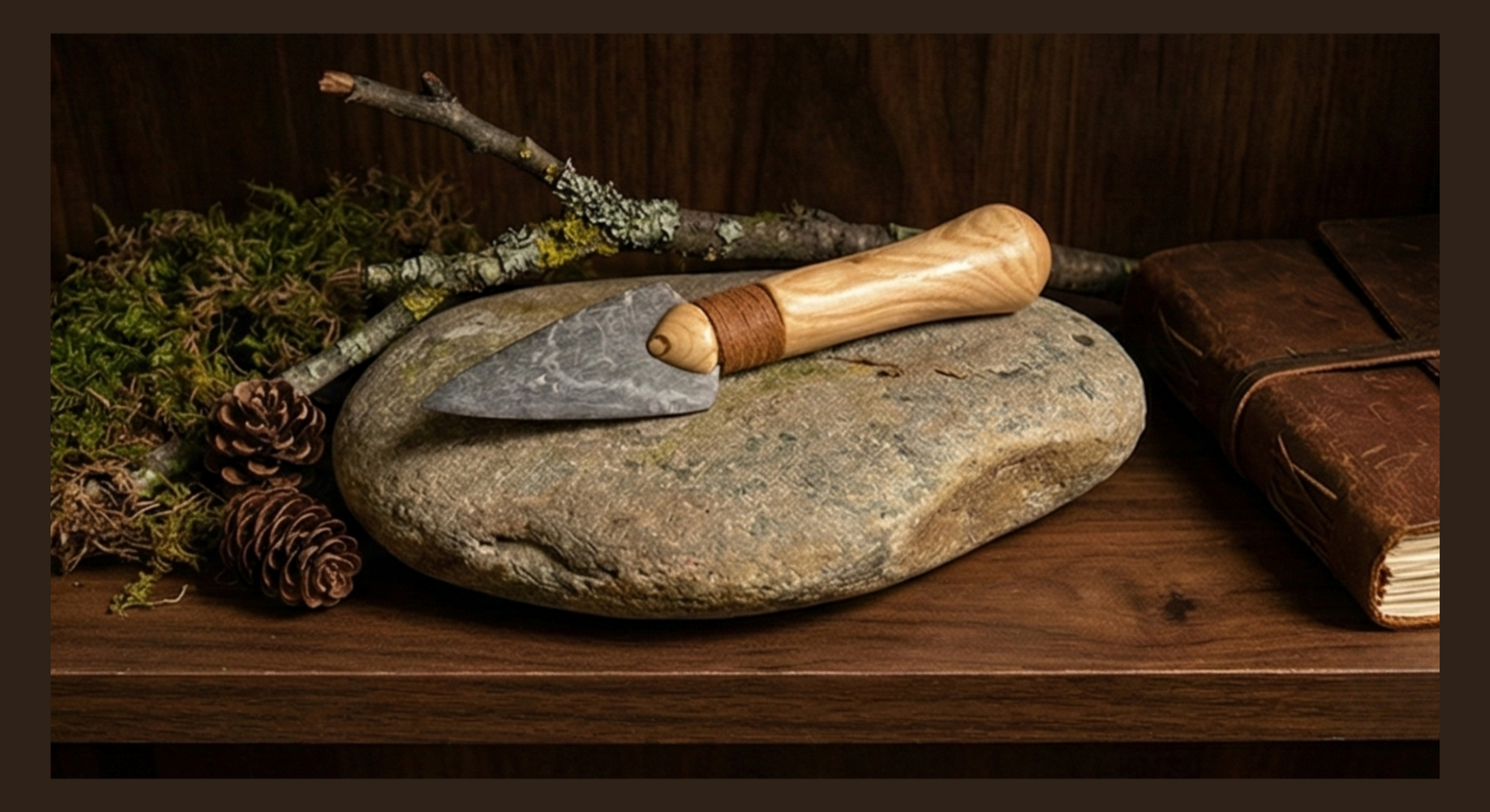 Úvaz: přírodní kůže v teplém hnědém odstínu – funkční i estetický prvek, který propojuje kámen a dřevo v harmonický celek. Symbolizuje spojení lidského řemesla s přírodními živly.