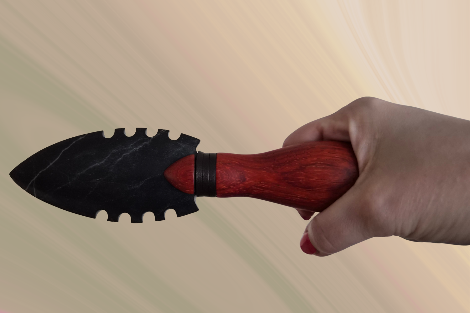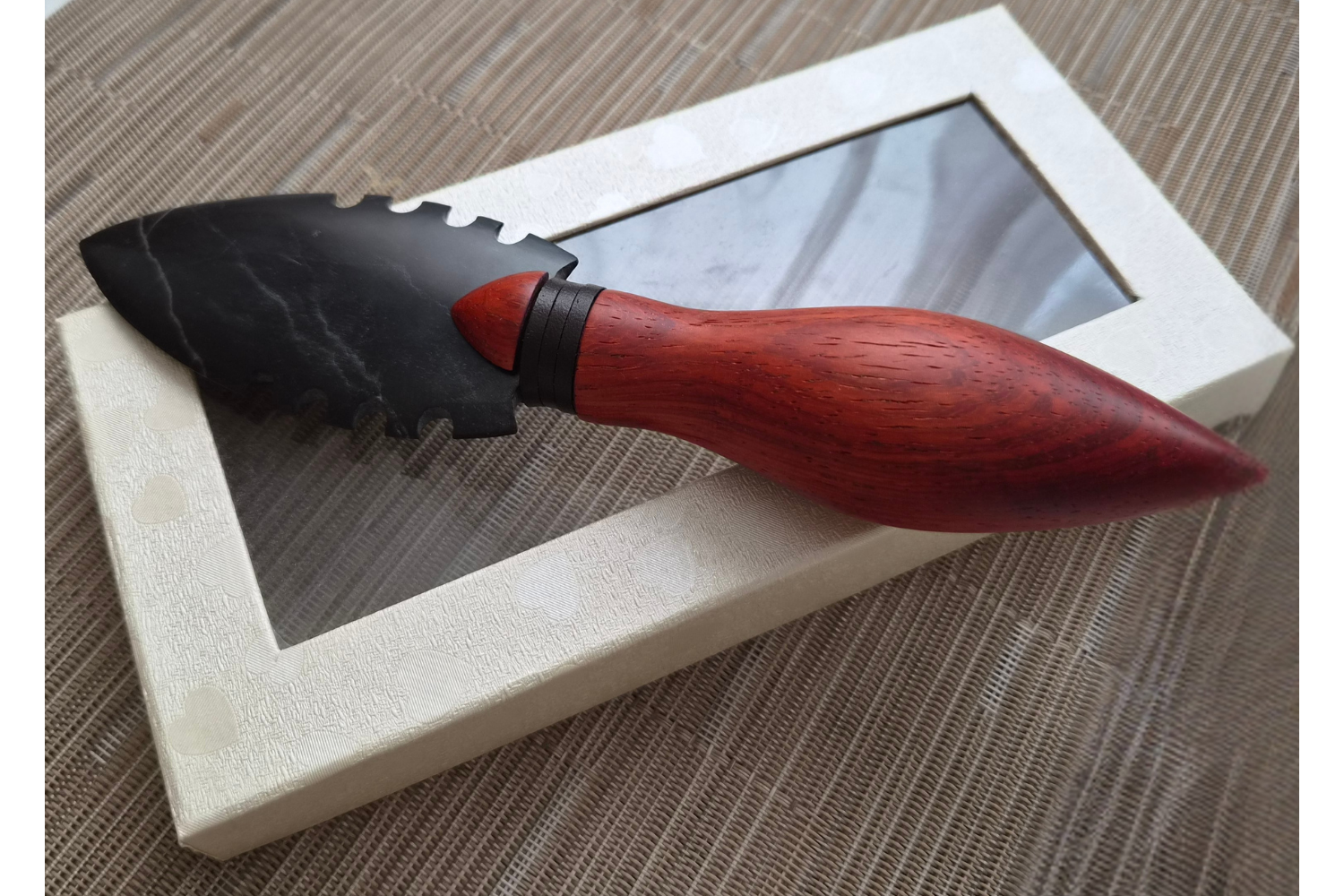 Kresba dřeva, struktura kamene i ruční zpracování nechaly vzniknout artefakt, který působí přirozeně a pevně zároveň. Není to věc pro každého. Je to solitér pro ty, kdo jej dokáží ocenit.