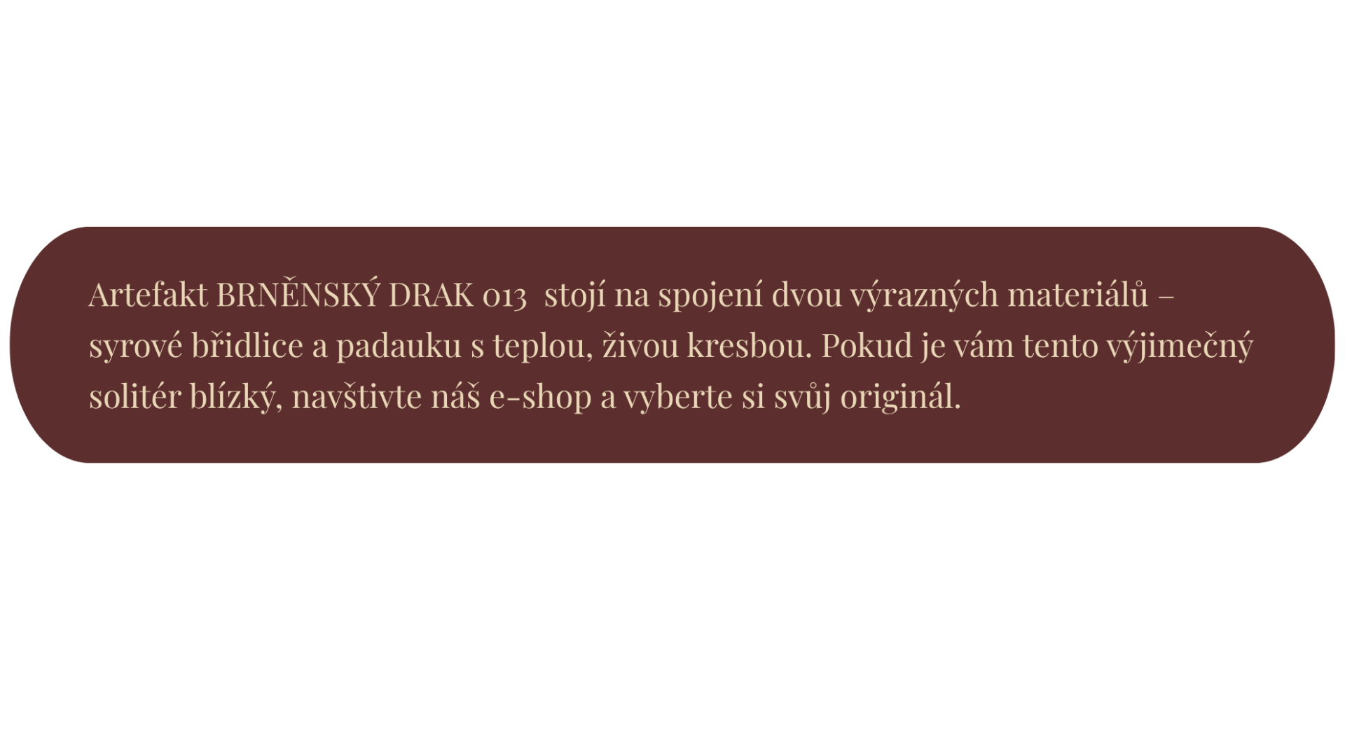 BRNĚNSKÝ DRAK není nástroj ani replika. Je to dekorativní solitér inspirovaný místem, legendou a vztahem k poctivému materiálu.