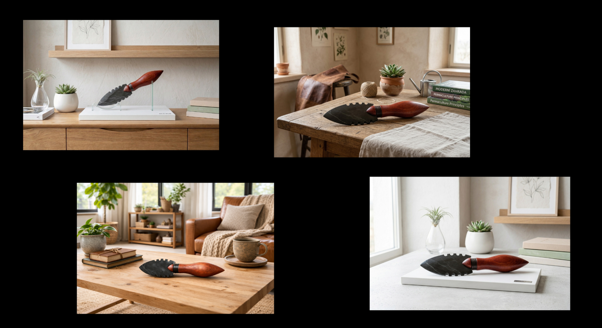 Úvaz: tmavá kůže – kontrastní detail, který spojuje funkci a estetiku. Symbolizuje spojení mezi přírodním materiálem a lidským zpracováním