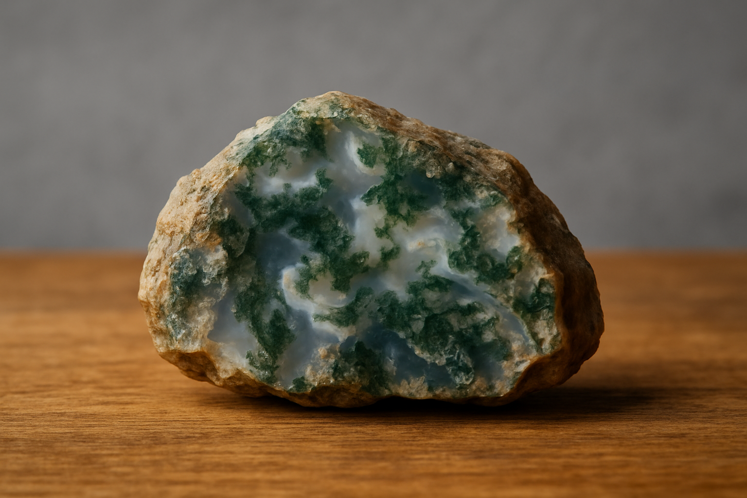 Achát mechový (SiO₂) je odrůda chalcedonu, která vznikla ukládáním oxidu křemičitého v dutinách hornin. Typickým znakem jsou zelené, hnědé či černé dendritické inkluze připomínající mech, větvičky nebo krajinu, podle nichž dostal své jméno.