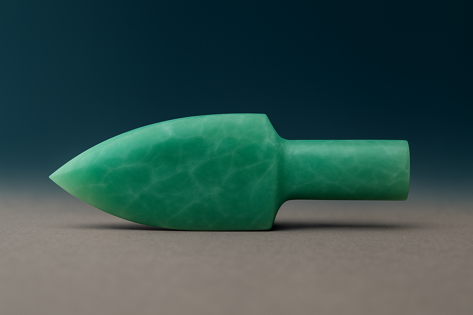 Dekorativní použití: Chalcedon se využívá především pro rukojeti a ozdobné aplikace. Nože s tímto kamenem působí elegantně a harmonicky, jejich hodnota spočívá v estetice a symbolice, nikoli v praktické funkčnosti. Zelený chalcedon zaujme jemnými tóny od světle zelené po modrozelenou, často s lehkým průsvitem. Je oblíbený u sběratelů, kteří oceňují jemnost a harmonii.