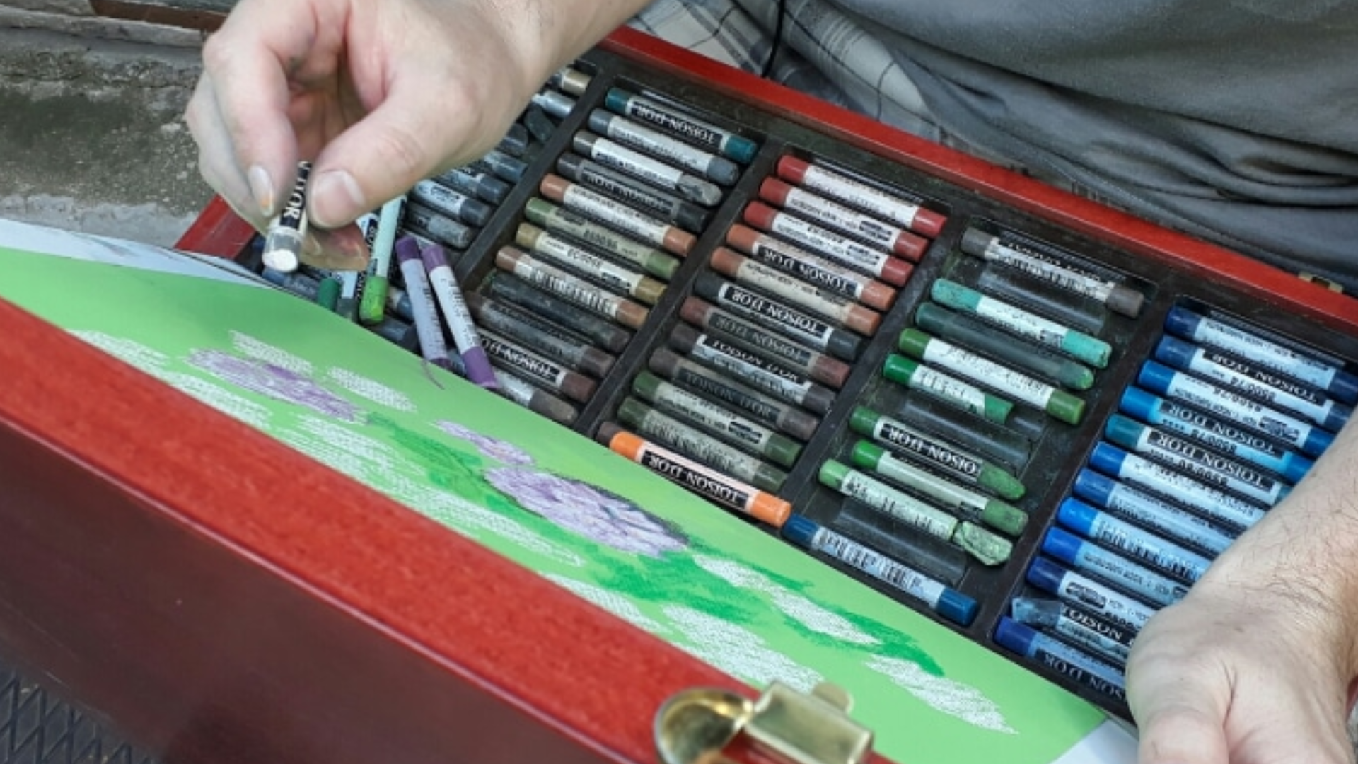 Samozřejmě malovat venku je bezkonkurenčně největší zábava, ale to máte: bágl, pastely, stojan, papíry, desky, stoličku, foťák, kdyby se nestíhalo, to znamená další bágl, objektiv, příslušenství, stativ...
