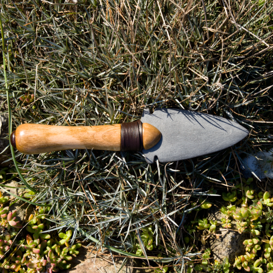 Dekorativní artefat z šedé, jemně vrstvené břidlice s rukojetí