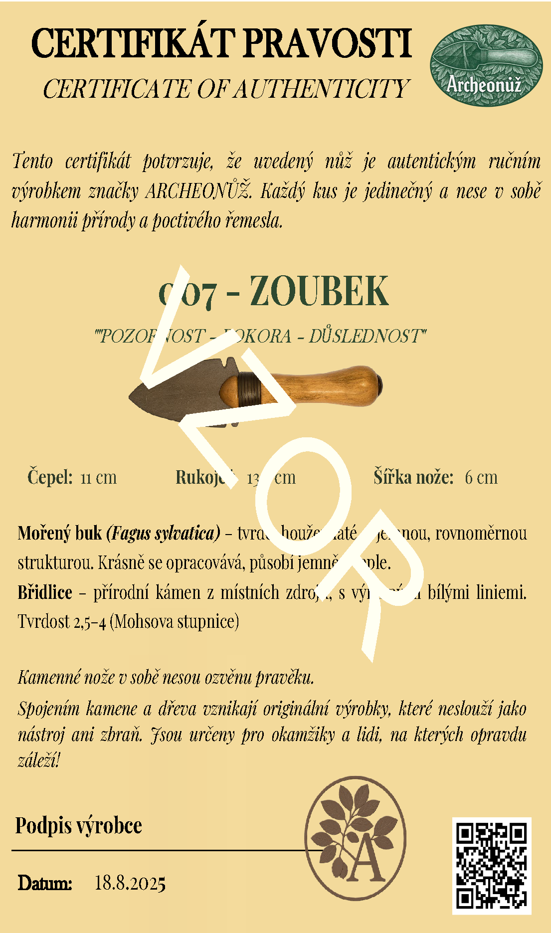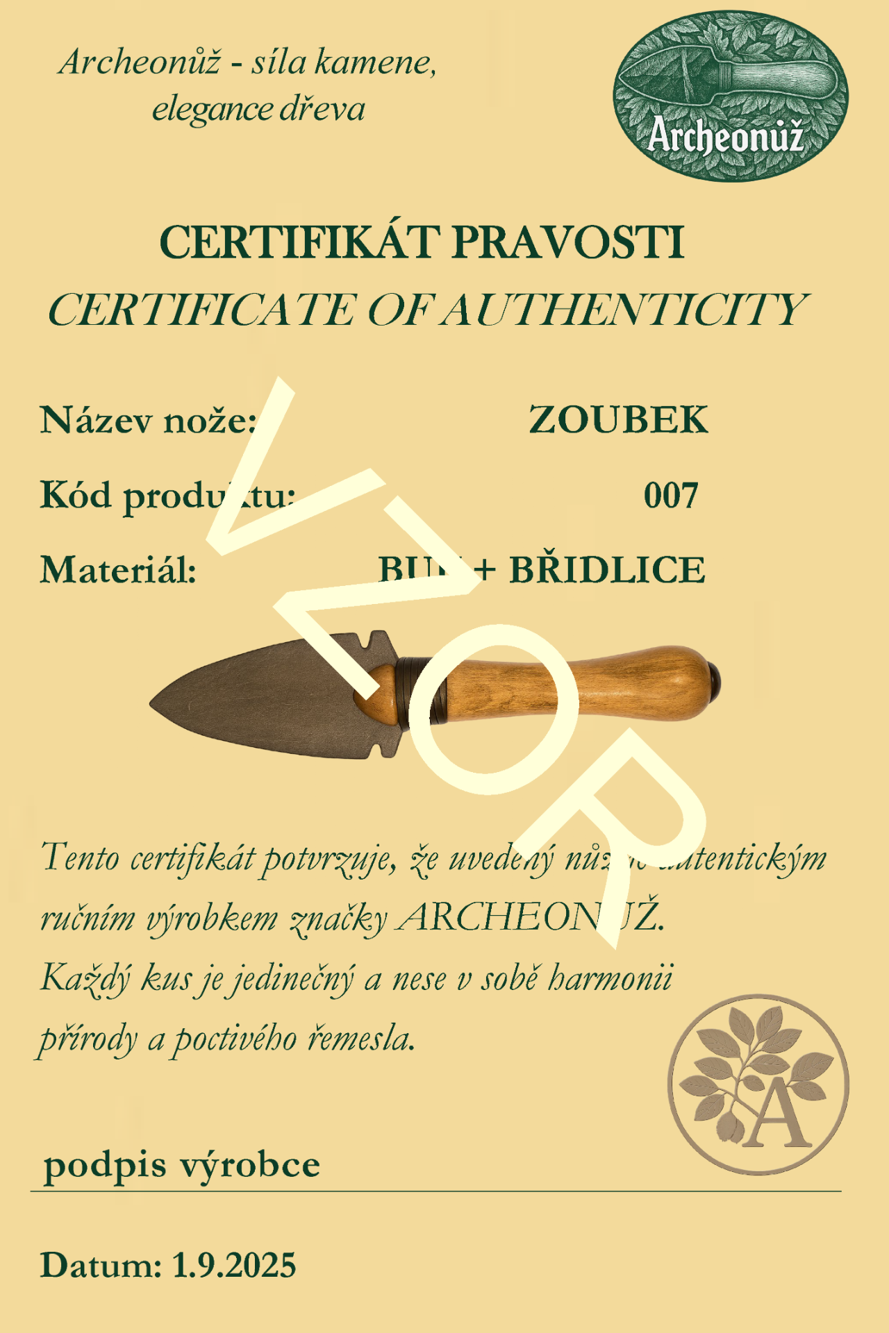 Součástí je Certifikát pravosti Archeonůž s podpisem autora.