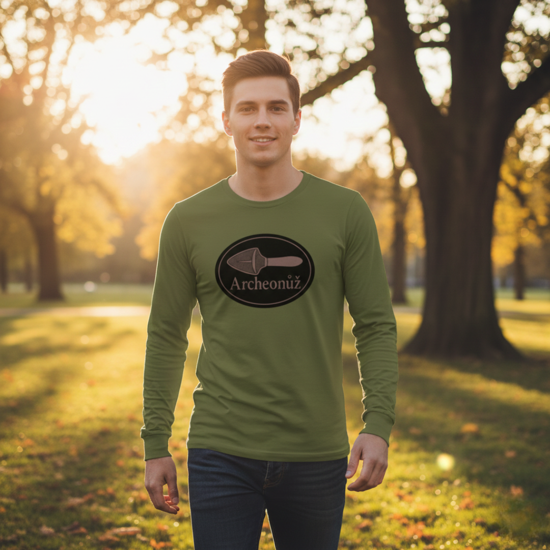 Elegantní černé tričko s dlouhým rukávem a logem Archeonůž – spojení přírodní estetiky a řemeslné jednoduchosti.