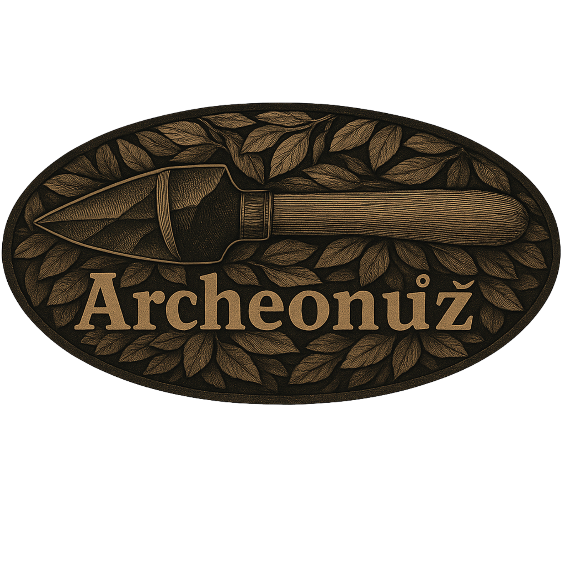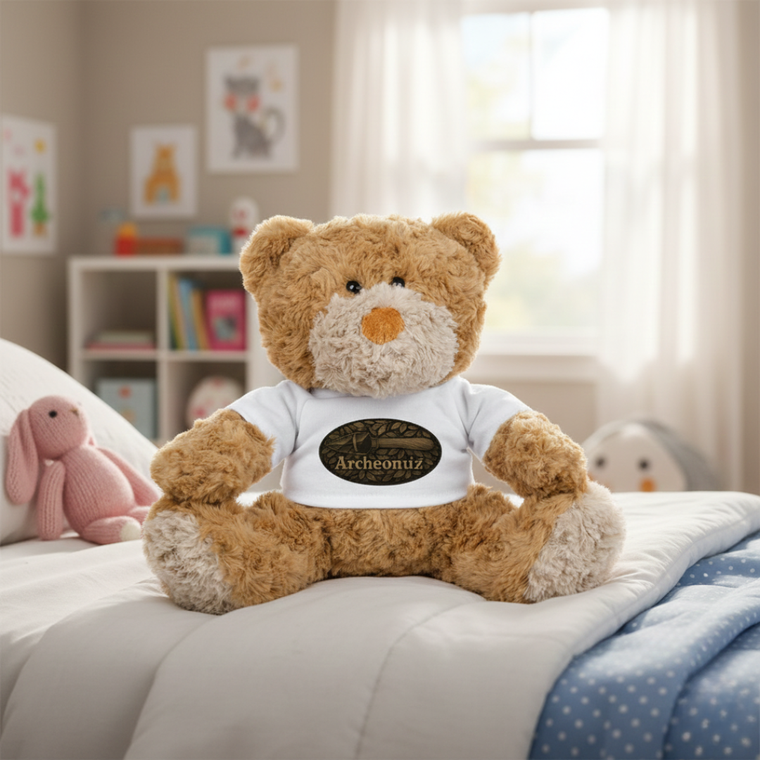 Měkký plyšový medvídek s bílým tričkem a motivem Archeonůž.