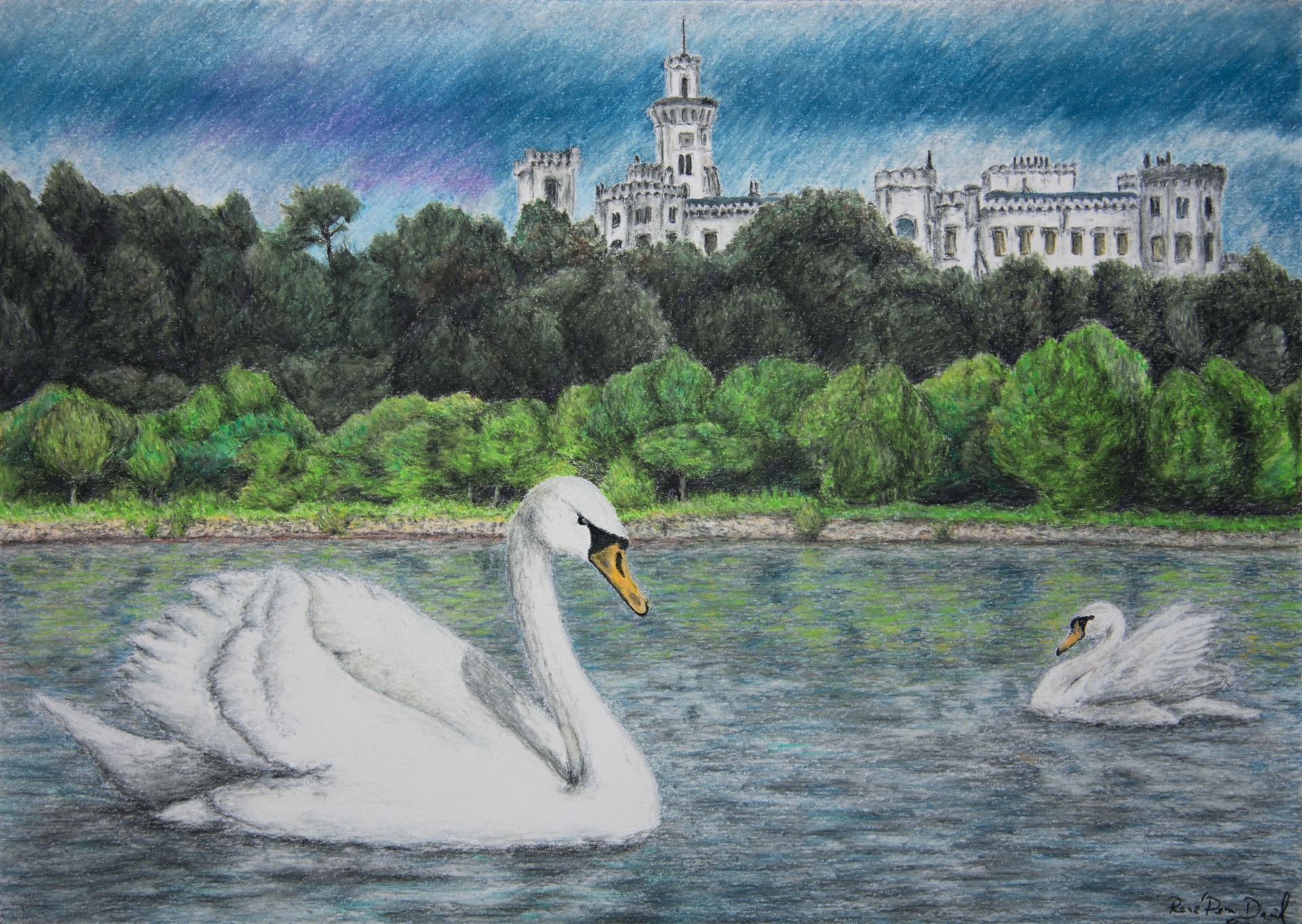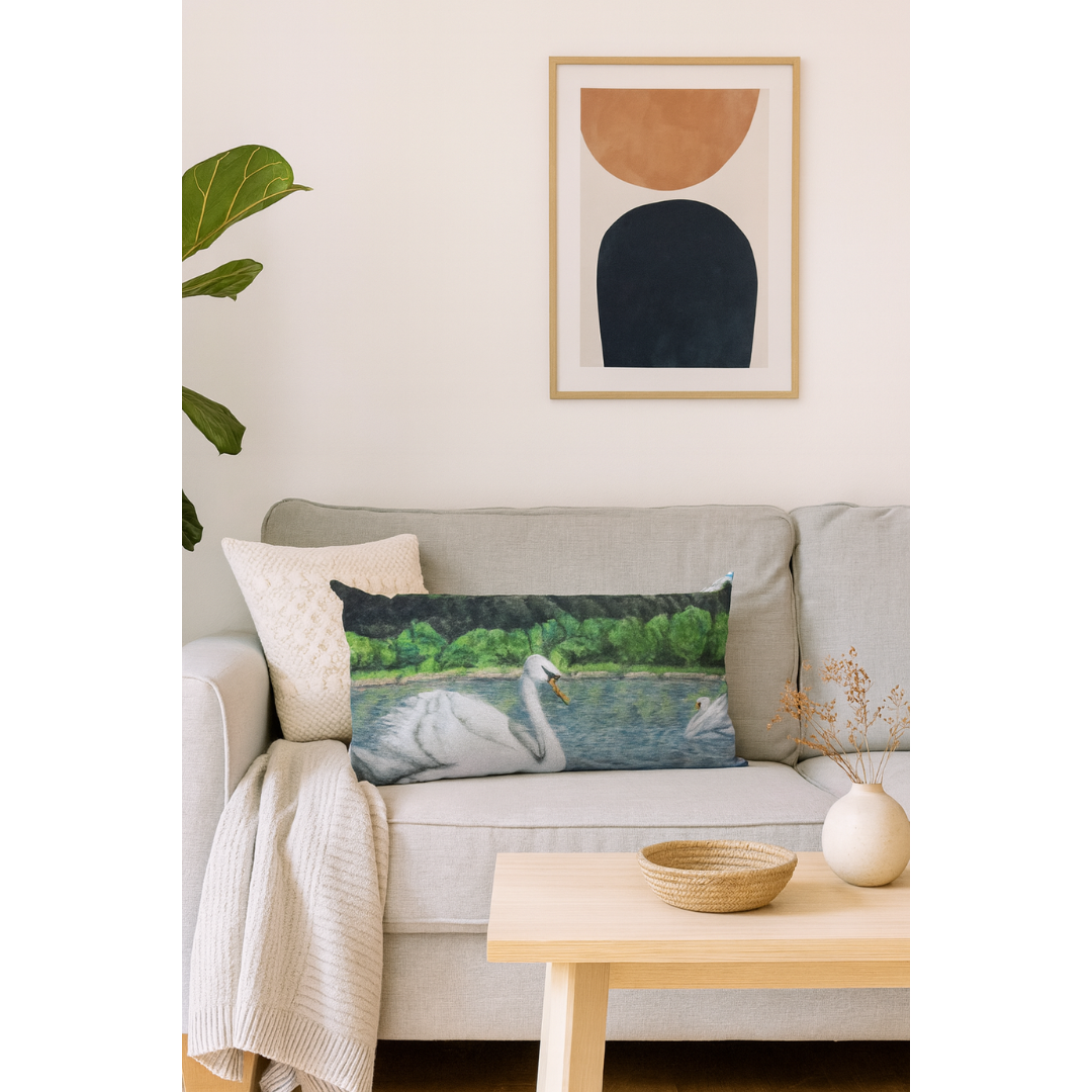 Romantický motiv labutí na klidné vodní hladině dodá polštáři příjemně uklidňující vzhled.
