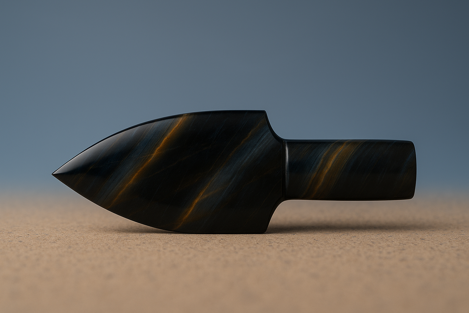 Dekorativní použití: Sokolí oko okouzluje svým hedvábným leskem a proměnlivými modrošedými tóny, které působí dojmem živého pohybu. V čepelích nožů vytváří působivý, až mystický efekt, který se mění s každým úhlem pohledu. Tento kámen dodává nožům charakter talismanu i originálního sběratelského kousku.